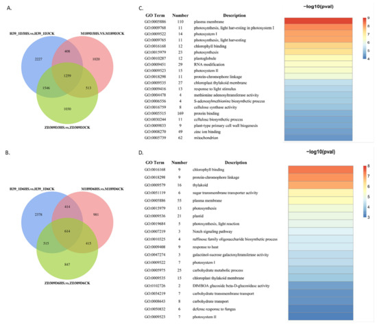 The transcriptome data showed time-dependent gene expression patterns under heat treatments, and the heat stress response of ZD309 was different from those of its parental lines. The number of up-regulated DEGs is more than down-regulated DEGs at each time point in all three materials. This indicated that more genes were switched on than switched off under heat stress. In D3HS treatment, 5440 (3797 up- and 1643 down-regulated), 3200 (1667 up- and 1533 down-regulated), and 4348 (2861 up- and 1487 down-regulated) DEGs were identified within the heat-stressed H39_1, M189, ZD309, and their controls, respectively (Figure 2A). In D6HS treatment, 3921 (2815 up- and 1106 down-regulated), 2424 (1486 up- and 938 down-regulated), and 2391 (1266 up- and 1125 down-regulated) DEGs were identified within the heat-stressed H39_1, M189, ZD309, and their controls, respectively (Figure 2B). In D3HS treatment, 1259 common DEGs were found among the three tested materials (Figure 2A). Moreover, 2805 genes were overlapped between the inbred line H39_1 and the hybrid ZD309, 1772 genes were overlapped between M189 and ZD309, as well as 1667 genes were overlapped between H39_1 and M189. In D6HS treatment, 614 common DEGs were found (Figure 2B). A total of 1129, 1029, and 1028 genes were shared between H39_1 and ZD309, M189, and Z309, as well as H39_1 and M189, respectively. Compared with the D6HS treatment, more DEGs were detected in ZD309 and its parental lines in the D3HS treatment. This suggested that ZD309 and its parental lines start to adapt to the stress as the treatment goes on. Overlapped DEGs between ZD309 and H39_1 were more than those of M189, which implied H39_1 contributed larger genetic gains to ZD309 with regard to heat tolerance.