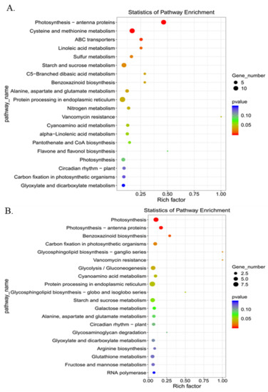 Clean reads were aligned to the B73 maize reference genome (B73 RefGen_V4.42, available online: http://ensembl.gramene.org/Zea_mays/Info/Index, accessed on 1 January 2022) using the HISAT2 V2.1.0 [44]. The mapped reads for each sample were assembled using StringTie (available online: https://ccb.jhu.edu/software/stringtie/, accessed on 1 January 2022) [45]. All subset transcriptomes from each sample were merged to build a comprehensive transcriptome using perl scripts. When the whole transcriptome was done, StringTie and edgeR (available online: http://bioconductor.org, accessed on 1 January 2022) [46] was used to estimate the expression levels of all transcripts. The differentially expressed genes (DEGs) were filtered with |log2 (fold change)| > 1 and statistical significance (p-value < 0.05) by R package. Gene Ontology (GO) enrichment was performed by using agriGO (available online: http://bioinfo.cau.edu.cn/agriGO/index.php, accessed on 1 January 2022) [47]. GO terms with FDR ≤ 0.05 were significantly enriched. Kyoto Encyclopedia of Genes and Genomes (KEGG) enrichment was performed by using an online server (www.genome.jp/kegg, accessed on 1 January 2022) [48]. KEGG pathways with FDR ≤ 0.05 were significantly enriched.
