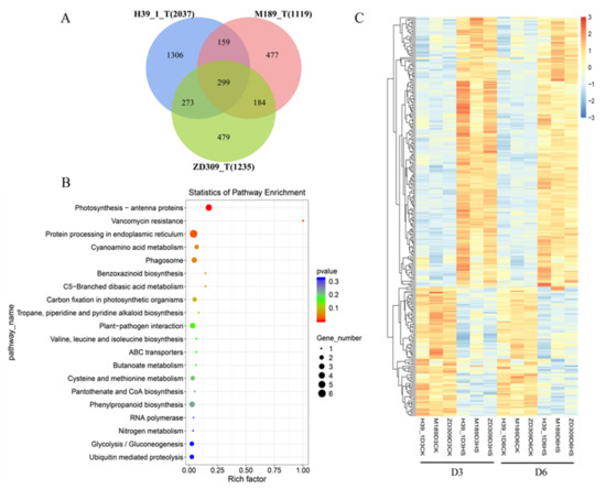 The conserved DEGs identified between the two heat treatments. (A) Numbers of DEGs between the two heat treatments in the tested three genotypes; (B) Kyoto Encyclopedia of Genes and Genomes (KEGG) enrichment analysis for between the two heat treatments in the tested three genotypes. The x-axis indicated the rich factor, and the y-axis indicated pathway; (C) expression patterns of the identified 299 conserved DEGs. The color scale at the right of the figure indicates the gene expression levels transformed by log10 (FPKM + 1).
