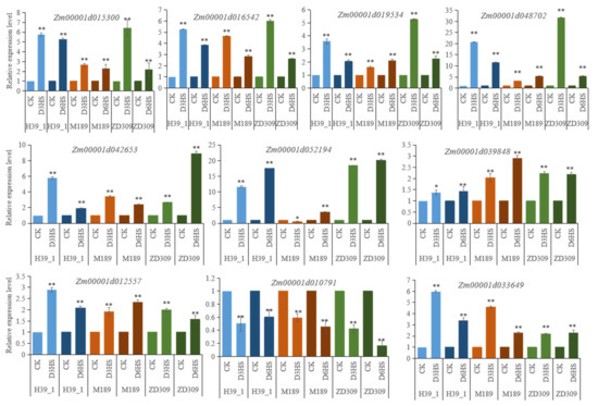 Verification the expression of DEGs by qRT-PCR. Bars show standard error of the relative expression levels. * and ** represent that the corresponding gene expression level in heat-stressed maize plants are significantly and very significantly different from the control at p < 0.05 and p < 0.01 levels, respectively.