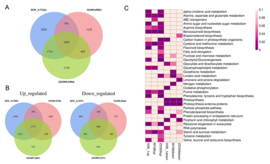 In D3HS or D6HS treatments, 5504 (3463 up- and 2151 down-regulated) DEGs in hybrid ZD309 were identified. A total of 7324 (5189 up- and 2237 down-regulated) and 4505 (2538 up- and 2046 down-regulated) DEGs were identified in inbred lines H39_1 and M189 (Figure 6A). Of these DEGs, 1982 DEGs were solely expressed in the three tested materials, including 1171 up-regulated and 684 down-regulated genes (Figure 6B). The unique DEGs were subjected to KEGG pathway enrichment (Figure 6C). The up-regulated DEGs in ZD309 and its parental lines were strongly enriched in alanine and aspartate and glutamate metabolism, benzoxazinoid biosynthesis, cysteine and methionine metabolism, and ribosome biogenesis in eukaryotes. The up-regulated DEGs in H39_1 were preferably enriched in alpha-linolenic acid metabolism, amino sugar and nucleotide sugar metabolism, valine and leucine and isoleucine biosynthesis, amino sugar and nucleotide sugar metabolism, flavonoid biosynthesis, phenylalanine and tyrosine and tryptophan biosynthesis, and pentose phosphate. The up-regulated DEGs in M189 were preferably enriched in ABC transporters and starch and sucrose metabolism. Indeed, the up-regulated DEGs in ZD309 were preferably enriched in alpha-linolenic acid metabolism, carbon fixation in photosynthetic organisms, glycolysis/gluconeogenesis, linoleic acid metabolism, purine metabolism, phenylalanine and tyrosine and typtophan biosynthesis, fructose and mannose metabolism, and tyrosine metabolism. On the other hand, the down-regulated DEGs in ZD309 and its parental lines were greatly enriched in either photosynthesis or photosynthesis-antenna proteins. In comparison to the parental lines, the down-regulated DEGs in ZD309 were mainly enriched in brassinosteroid biosynthesis, limonene, and pinene degradation. Overall, genes associated with stress response (such as response to biotic stimulus, response to water deprivation, and response to hydrogen peroxide) were preferably enriched in up-regulated DEGs in ZD309. DEGs in inbred line H39_1 share more common pathways with ZD309 than inbred line M189.