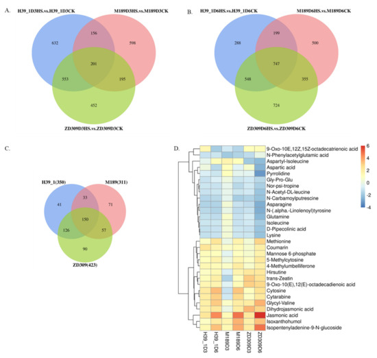 Of these detected DEMs, 350, 311, and 423 DEMs were up-regulated in H39_1, M189, and ZD309, respectively (Figure 7C). A total of 150 DEMs were found across the tested materials, which might be essential for heat tolerance. Under heat stress, some metabolites were enhanced, including sugars and glycosides (e.g., mannose 6-phosphate, isopentenyladenine-9-N-glucoside, and cytarabine), methionine and organic acids (e.g., jasmonic acid (M211T234), dihydrojasmonic acid, and 9-Oxo-10(E), 12(E)-octadecadienoic acid), nucleosides and nucleotides (e.g., cytosine and 5-Methylcytosine) (Figure 7D, Table 3). In contrast, other metabolites, amino acids (e.g., lysine, isoleucine, and aspartic acid), and alkaloids were reduced (Figure 7D, Table 3). Furthermore, 41, 71, and 90 metabolites were found to be associated with heat stress specifically in H39_1, M189, and ZD309, respectively. After heat treatment, JA abundance was significantly increased in three tested materials versus the corresponding controls. JA abundance was also significantly increased in D6HS treatment compared with that in D3HS treatment.