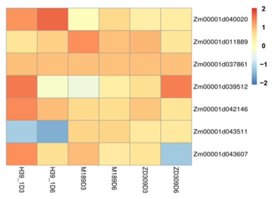 Of the detected DEGs, 15 hsp (HSPs encoding genes) were differentially expressed under heat treatments (Table 2). In D3HS and D6HS treatments, traf21 (encodes TNF receptor-associated factor 21, a heat-response protein), hsp13, Hsp20 were down-regulated in all three tested materials. However, hsp19, Hsp20, Zm00001d015777 (encodes a chloroplast small heat shock protein), B6SIX0 (encodes 16.9 kDa class I heat shock protein 1), hsp26, and hsp11 were up-regulated in ZD309 and its parental lines. Strikingly, hsp10, hsp22, mbf2 (encodes multiprotein-bridging factor 1c), gpc3 (encodes glyceraldehyde-3-phosphate dehydrogenase3) were up-regulated in ZD309 and H39_1 in two heat treatments but down-regulated in M189 in D3HS treatment. Overall, more hsps and heat response-associated genes were activated in the D6HS treatment than in the D3HS treatment.
