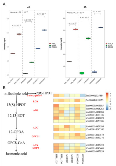 Combined transcriptome and metabolome analyses have demonstrated that JA is a key regulator to confer heat tolerance. Upon metabolomics, JA raised significantly under heat stress. Compared with M189, the JA contents (M211T234) were increased in H39_1 and ZD309 (Figure 9A). The JA levels were enhanced along with the heat stress. The JA contents (M211T234) in D3HS treated H39_1, M189, ZD309 were increased 4.8, 2.5, and 4.6 folds versus the corresponding controls, respectively. The JA (M211T234) contents in D6HS treated H39_1, M189, ZD309 were increased 21.7, 27.9, and 73.3 folds versus the corresponding controls, respectively. The expression pattern of JA biosynthesis (α-linolenic acid metabolism) genes under heat stress was further analyzed (Figure 9B). Overall, most genes were up-regulated among three materials, particularly in H39_1 and ZD309. Zm00001d053675 (encoding LOX) were up-regulated among the three tested materials, with the highest level in D3HS-treated ZD309 plants. However, six maize AOS encoding genes showed a higher level in H39_1 and ZD309 materials of D3HS treatment. Two AOC encoding genes, Zm00001d029594 and Zm00001d047340, were up-regulated among the three tested materials under heat stress, with a relatively lower level of Zm00001d029594. Two OPCL1 encoding genes, Zm00001d027519 and Zm00001d043376, were also up-regulated among the tested materials. In contrast, Zm00001d043376 showed a higher level in D6HS than D3HS treatments. Moreover, Zm00001d035854, encoding α-dioxygenase, was the least level in ZD309 in D6HS treatment.