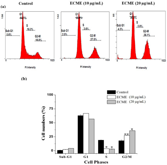 ECME induces G2/M phase cell cycle arrest in A549 cells. (a) The histogram shows the distribution of cell phases after treatment with corresponding IC50 and its half concentrations (20 and 10 µg/mL) of ECME. (b) The values indicate the percentage of cells in the indicated phases of the cell cycle. Significant differences from the control are indicated by * p < 0.05; ** p < 0.01.