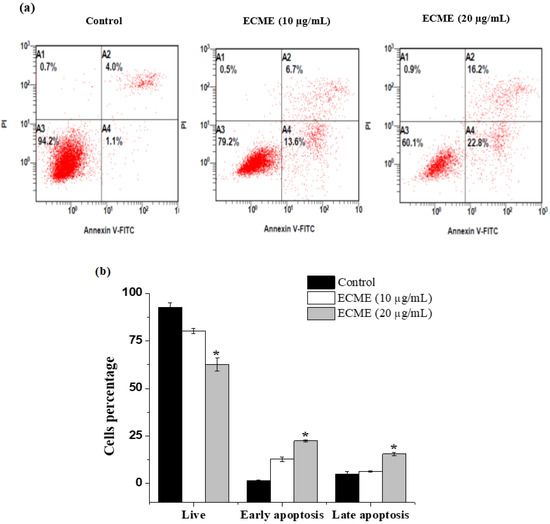 Apoptosis induction in A549 by ECME as detected by Annexin V/PI assay. (a) Apoptosis histogram of control cells, and cells treated with 10 and 20 µg/mL. A1: Cells labeled with PI only (necrosis), A2: cells labeled with annexin V and PI (late apoptosis), A3: Viable cells and A4: early apoptotic cells (Annexin V+/PI−) −. (b) Apoptosis percentage data from three experiments (mean ± SD, * p < 0.05 vs. control group).