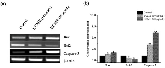 Effects of ECME on the expression levels of Bax, Bcl-2 and caspase 3 genes determined via RT-PCR analysis. A549 cells were exposed to ECME at two effective concentrations of ECME for 48 h, while the negative control was treated with DMSO (0.01%). (a) The expression of apoptosis-related genes, including Bax, Bcl-2 and caspase-3 were detected by RT-PCR and β -actin was employed as internal a reference. (b) The quantitative level is display in histograms and the average value (n = 3), for the control was set at one. * p < 0.05, ** p < 0.01 vs. the control group.