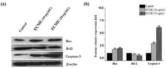 Effect of ECME on protein levels of proapoptotic and antiapoptotic proteins. A549 cells were treated with vehicle (0.01% DMSO) or at two effective concentrations of ECME for 48 h. (a) Immunoblot analysis displaying expression levels of Bax, Bcl-2 and Caspase-3. (b) Graph depicting the relative intensity of studied proteins versus ECME concentration. The data is the average of three experiments with standard deviation. ** p < 0.01 vs. the control group.