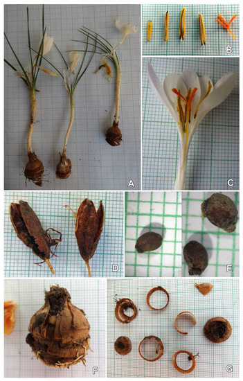 A spring synanthous geophyte is shown in Figure 1 with the following features: corm oval-suborbicular, 13.5–25 mm in diameter, with membranous-coriaceous tunic, yellowish-brown, with separating basal rings; Basal rings 1.2–2.5 mm thick (Figure 1G) with unclear, slightly visible irregular dentation; plant height 100–210 mm; leaves 4–6(–7), 0.8–2.3 mm wide; flowers 2–3(–4); perigone segments niveous-white or outer ones with sprayed pale-blue coloration (Figure 1A,C); rounded to slightly acuminate; 19–33 × 6–11 mm long and 15–26 × 5–12 mm wide; perigone tube 6–10 cm long, white or bluish–lilac. (Figure 2); throat glabrous, white; filaments 3.8–10 mm; anthers 8–12(16) mm long with blackish basal lobes, or exceptionally with blackish stripes on the internal side, along the thecas (Figure 1B), on both sides of the white connective; stigma orange-reddish, trilobate (stylodia 3–5 mm), usually shorter than or equal to anther length; Capsule ellipsoid 15–21 × 4.3–7.4 mm (Figure 1D); seeds oval, dark brown 2.3–3.4 × 1.5–2.1 mm.
