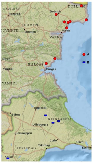 Localities of Crocus pallidus (A) in Bulgaria and C. thracicus (B) in Turkey. Map created at GPSVisualizer.com (accessed on 16 March 2021). Leaflet | NGS maps from ESRI/ArcGIS.