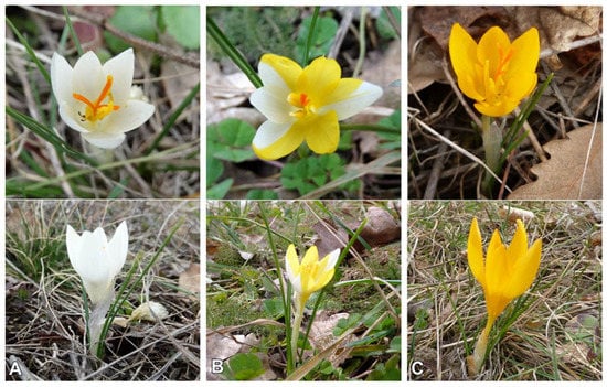 - Delipavlov, D. Crocus L. In Key to the Plants in Bulgaria; Delipavlov, D., Cheschmedzhiev, I., Eds.; Agrarian University Academic Pres: Plovdiv, Bulgaria, 2003; pp. 456–457. [Google Scholar]