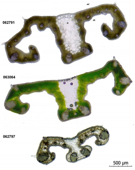 Crocus pallidus leaf cross-sections (4×). Abbreviations: ad—adaxial side, ab—abaxial side, la—lacuna area. Voucher numbers are shown near the cross-sections.