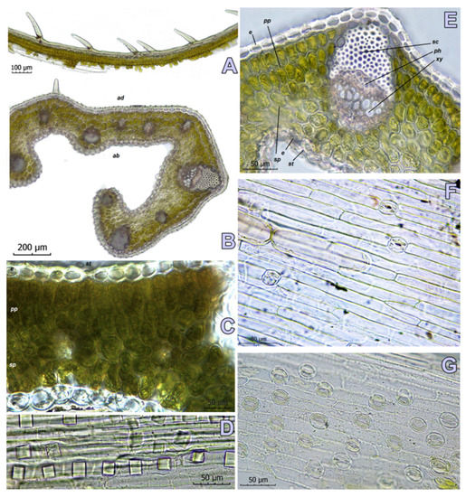 Leaf anatomy of Crocus pallidus. (A) Papilles on the ribs—adaxial surface; (B) section of the shoulder (SOA 062791); (C) detail of the leaf with visible adaxial stomata (SOA 062797); (D) crystals; (E) subterminal vascular bundle in the shoulder; (F) adaxial epidermis with stomata; (G) abaxial epidermis with stomata (SOA 062791). Abbreviations: ad—adaxial side, ab—abaxial side, la—lacuna area, e—epidermis, pp—palisade parenchyma, sp—spongy parenchyma, sc—sclerenchyma cap, ph—phloem, xy—xylem.