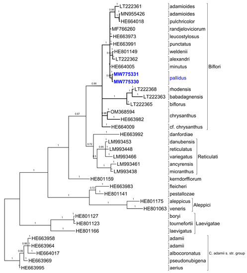 Placement of Crocus pallidus in the phylogenetic tree of sect. Nudiscapus obtained by Bayesian phylogenetic inference of the nuclear rDNA ITS regions using the methodology of Harpke et al. [28]. Posterior probabilities are designated by numbers. See Table A1 for details.