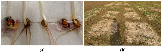 (a)—Grains infected by Microdochium nivale; (b)—an experimental field infected by Microdochium nivale, 2021.