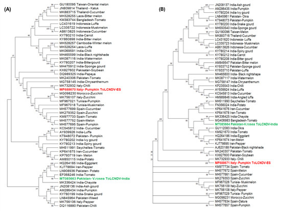 Phylogenetic analysis of two ToLCNDV isolates from Italy (ToLCNDV-ES) and Pakistan (ToLCNDV-India). Phylogenetic relationships were generated using the neighbor-joining methods in the MEGA 7 program. Numbers at branch internodes represent bootstrap values (1000 replicates). The ToLCNDV isolates from Italy (Accession number MF688670/MF688671) and Pakistan (Accession number: MT085663/MT085664) used in this study are highlighted by red and green colors, respectively. (A) DNA A component. (B) DNA B component.