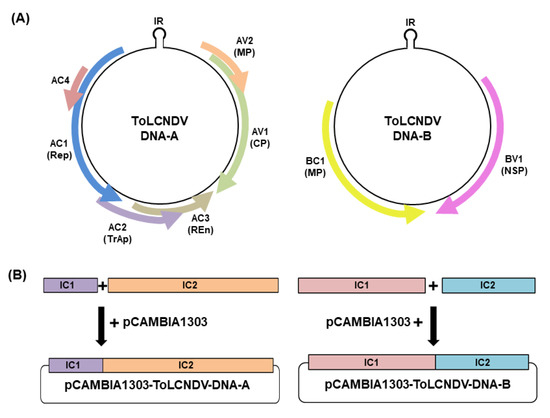 Genome structure and infectious clone construction of ToLCNDV. (A) Genome structure of DNA A and DNA B of ToLCNDV. (B) Scheme for ToLCNDV infectious clone construction by partial tandem repeat construction method. Two fragments of each component were generated and ligate with pCAMBIA 1303 vector to harbor a recombinant plasmid.