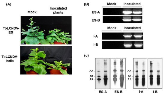 Infectivity of two ToLCNDV isolates in Nicotiana benthamiana at 21 dpi. (A) Phenotypes of infected N. benthamiana with ToLCNDV-ES and ToLCNDV-India. The infected plants showed severe stunning, leaf curling symptoms. (B) Detection results of inoculated plants by PCR. (C) Southern hybridization blotting results. PCR bands are used as probe. ES-A, ES-B, I-A, and I-B are abbreviations of amplicons that were detected from ToLCNDV-ES DNA A, DNA B and ToLCNDV-India DNA A, DNA B, respectively. OC, open circular dsDNA; SC, supercoiled dsDNA, SS, ssDNA.
