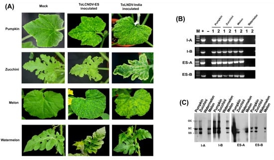 Then, ToLCNDV-ES and ToLCNDV-India were agroinoculated to four cucurbit crops which include pumpkin, zucchini, melon, and watermelon to check their infectivity. Each species was grown using commercial seeds from Italy and Korea. Three weeks after inoculation, except watermelon, three other crops tested positive for ToLCNDV-ES and ToLCNDV-India infection (Figure 4A and Table 1). All positive plants induced viral symptoms. Both ToLCNDV clones inoculated pumpkin and melon leaves induced yellow mosaic and curling symptoms. For zucchini plants, ToLCNDV-India infected plants showed heavier curling and mosaic symptoms than those of ToLCNDV-ES infected plants, demonstrating that ToLCNDV-ES had lower pathogenicity than ToLCNDV-India in this crop. Only watermelon presented no ToLCNDV infection including Italy or Korean cultivars. The infectivity of ToLCNDV was confirmed by PCR and Southern blot (Figure 4B,C). The specific amplicon was detected on PCR products of pumpkin, zucchini, and melon. Additionally, similar results of Southern blot were achieved on inoculated plants. The results indicated that both ToLCNDV isolates can infect cucurbit crops except watermelon.