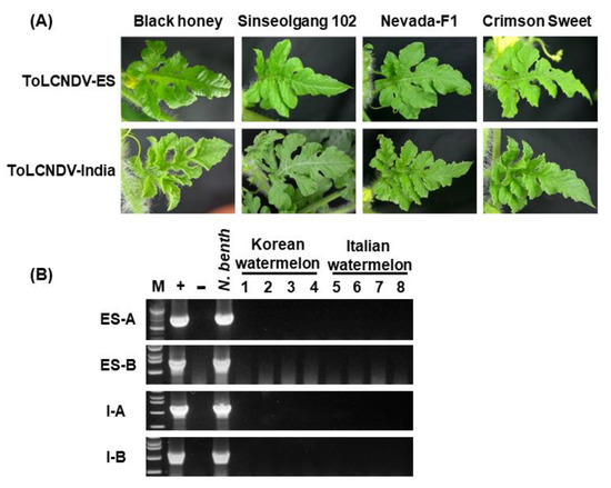 A screening study was conducted using different watermelon cultivars to confirm whether ToLCNDV truly has no pathogenicity on watermelon. Among eight cultivars used in this study, none of them showed ToLCNDV symptoms (Figure 5 and Table 2). All tested plants presented a normal phenotype at 30 dpi. According to PCR results, only ToLCNDV infected N. benthamiana plants used as positive plants were positive while others were negative, regardless of whether they were Korean or Italian cultivars. These results demonstrated that both ToLCNDV-ES and ToLCNDV-India did not infect watermelon cultivars used in this study. Therefore, those watermelon cultivars could be useful for ToLCNDV resistance in cucurbit crops.