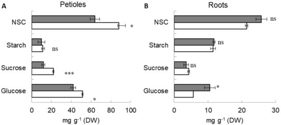 Carbohydrate concentration was analyzed in petioles and roots. Five milligrams of ground samples were used for sugar analysis. In addition, 80% of ethanol was used to extract glucose, sucrose, and starch at 78.5 °C for 10 min two times. Starch was determined by the precipitation, and the supernatant was concentrated centrifugally for 3 h (CC-105; Tomy Seiko, Tokyo, Japan). Non-structural carbohydrate (NSC) concentration was obtained from combined values of glucose, sucrose, and starch concentration. The detailed description of sugar analysis was explained in our previous study [13].
