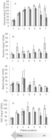 Glucose (A), sucrose (B), starch (C), and NSC (D) concentration at different petiole positions under control (empty bars) and waterlogged (filled bars) conditions. The numbers in X-axis mark the position of the leaf from the terminal down; * indicates the significant level at 0.05 probability level according to the Student t-test. Data correspond to the mean value and standard error (n = 3).
