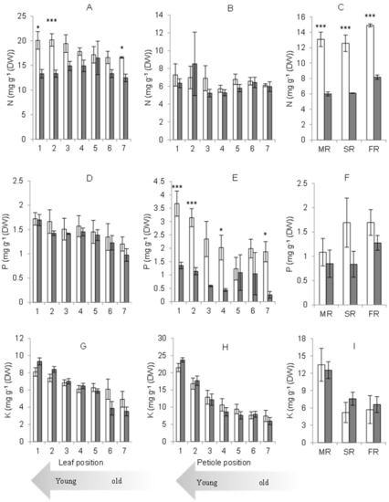 N, P, and K concentration in leaflets (A,D,G), petioles (B,E,H), and roots (MR: Main root, SR: Secondary root, and FR: Fine root) (C,F,I) under control (empty bars) and waterlogging (filled bars) conditions. The numbers in X-axis mark the position of the leaf from the terminal down; * and *** indicate the significant levels at the 0.05 and 0.001 probability levels, respectively, according to the Student t-test. Data correspond to the mean value and standard error (n = 3).