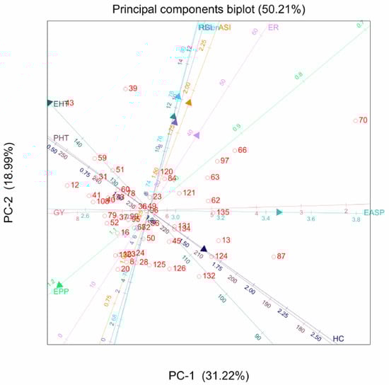 Principal component analysis biplot of genotype-by-grain yield and other agronomic traits of 135 maize hybrids: GY, grain yield; EPP, ears per plant; PHT, plant height; EHT, ear height; EASP, ear aspect; HC, husk cover; SL, stalk lodging; RL, root lodging; ASI, anthesis-silking interval.