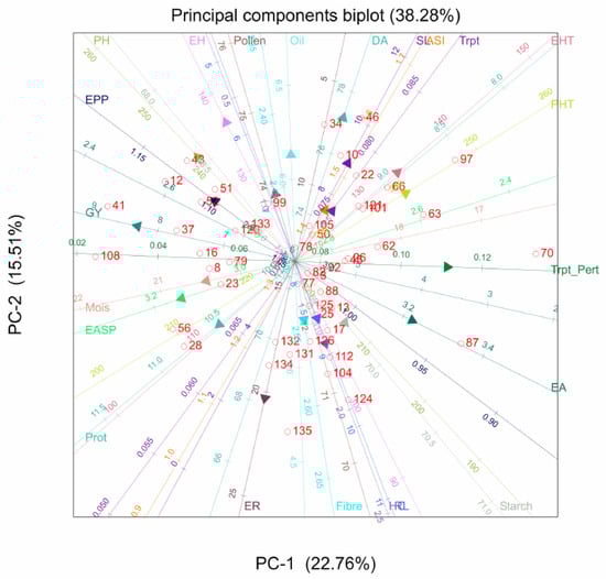 Combined principal component analysis biplot of 135 genotypes for grain yield, agronomic and quality traits: GY, grain yield; EPP, ears per plant; PH, plant height; EH, ear height; EASP, ear aspect; HC, husk cover; SL, stalk lodging; RL, root lodging; ASI, anthesis-silking interval; Trypt_Pert, tryptophan; Prot, protein.