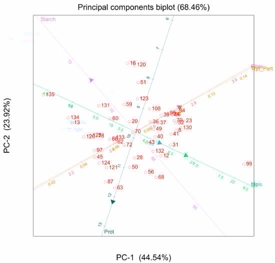 The PCA of the quality traits showed that the first three PCs accounted for 99.70% of the total variation (Table 3). However, only the first three PCs were significant, of which PC1 accounted for 63.70% of the variation. The most important traits on this axis were grain moisture and starch content. The second PC explained 20.50% of the variation, with protein, oil content, and starch as the most important traits on this axis; the third PC explained 15% of the variation, the important traits being protein, oil, and starch content.