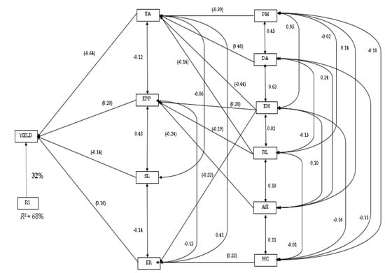 Path analysis showing the relationship of grain yield and agronomic traits of maize hybrids: yield, grain yield; ER, ear rot; EPP, ear per plant, EA, ear aspect, HC, husk cover, ASI, anthesis-silking interval; EH, ear height; PH, plant height; DA, days-to-anthesis; RL, root lodging; SL, stalk lodging. Values in parentheses are correlation coefficients, and other values are direct path coefficients. R1 represents the residual effects.