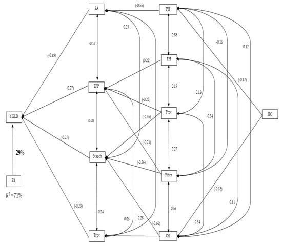 Path analysis showing the relationship of grain yield, agronomic and quality traits of 135 QPM and non-QPM maize hybrids: yield, grain yield; ER, ear rot; EPP, ear per plant, EA, ear aspect, HC, husk cover, ASI, anthesis-silking interval; EH, ear height; PH, plant height; DA, days-to-anthesis; Trypt, tryptophan; Prot, protein. Values in parentheses are correlation coefficients, and other values are direct path coefficients. R1 represents the residual effects.