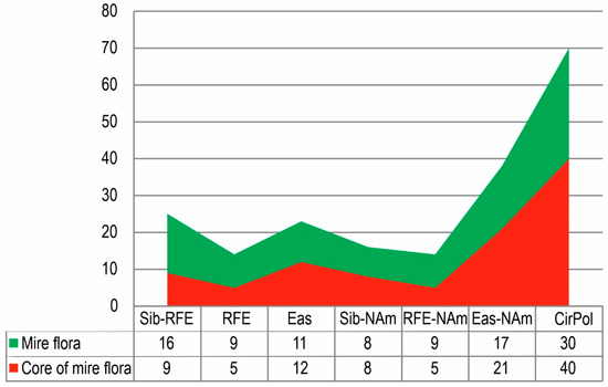 A literature review of mire vegetation in the adjacent mainland region allowed the inclusion of only 73 mainland species in the Bolshoy ecosystems. This confirms the need for special studies of the flora of these ecosystems [7,9]. When describing the mire vegetation, the authors of these works usually considered only the species that form the core mire flora. Characterized by high sustainability in mires, species capable of growing in other ecotopes that are indifferent to mire were not considered. However, these species groups are indicators of the degree of transformation or specificity of abiotic components.
