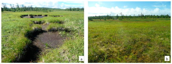 These mire ecosystems differ from the same coastal and continental ecosystems in a greater prevalence of organogenic cryogenic landforms and their size. As a result, remnant permafrost landforms can reach up to 100 m in diameter in the valley of the Amur River, but in the island mires, they barely reach 10 m in diameter, though similar heights of 1.8–2.5 m. The former is characterized by a predominance of woody vegetation (larch, aspen and birch), and the latter are mostly covered by shrubs and dwarf shrubs (Pinus pumila (Pall.) Regel, Empetrum spp., Rubus chamaemorus). In most cases, the landforms are in contact with the thermokarst depressions, which appear as hollow, often water-filled. Vascular plant species (Baeothryon alpinum, Baeothryon cespitosum, Menyanthes trifoliata, Calla palustris L., Sanguisorba parviflora (Maxim.) Takeda) that are typical of eutrophic or eutrophic-mesotrophic conditions most often grow in the hollows.