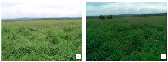 Reedgrass group of association: interstream area of the Argulad and the Levyi Argulad (a); estuary of Lake Bolshoe (b).
