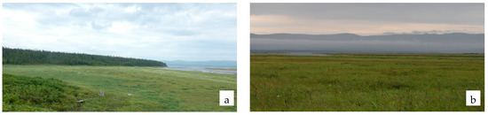 The contrast of the vegetation coverage of the mire ecosystems of the Bolshoy Shantar is most apparent in the regressive complexes, the nature of which is due to the features of the coastal marine climate against the background of global warming over the last few decades. This has significantly increased the intensity of the thermokarst processes that occur throughout the permafrost zone of the northern hemisphere [28,29,30].