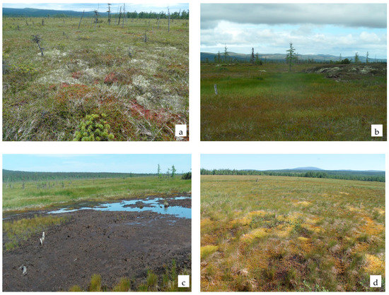 Sphagnum group of associations: interstream area of the Argulad and the Levyi Argulad (a,b); upper course of the Tundrovaya River (c,d).