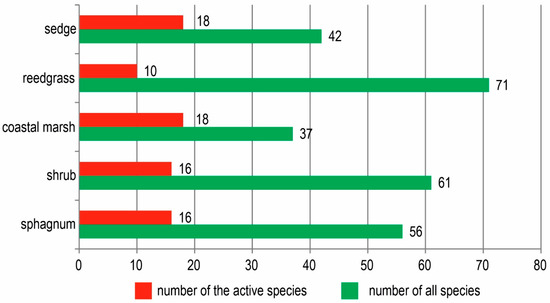 Thus, the largest species richness belongs to the reedgrass (71 species) and shrubs (61 species) groups of associations. The smallest number of species are represented by the coastal marshes (37 species) and sedge (42 species) group of associations. Within these two groups of association, the share of active species is much higher in the sedge (42.9%) associations and coastal marshes (48.6%), while in reed-grass and shrubs it is much lower and amounts to 14.1% and 26.2%, respectively. More detail on the ratios within the five groups of association is outlined in Figure 7.