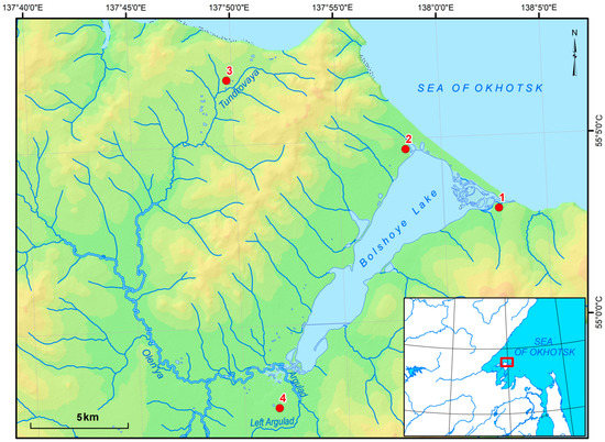 Research sites. 1. Estuary of Lake Bolshoe; 2. Northwestern coastal part of the Lake Bolshoe; 3. Upper course of the Tundrovaya River and 4. Interstream area of the Argulad and the Levyi Argulad.