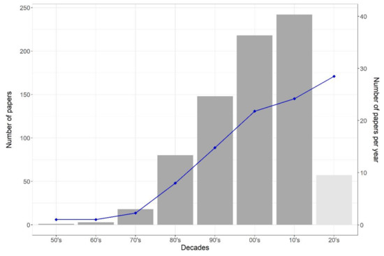 Number of papers per decade. The bars indicate the total number of papers retrieved in each decade, from the 1950’s to the 2020’s. The blue points indicate the average number of papers per year retrieved in each decade. The papers corresponding to the 2020’s consider only the years 2020 and 2021 (light grey).