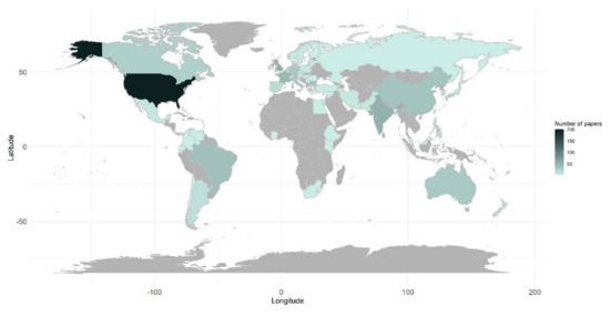 Country of origin of the studies. The total number of papers per country is shown as a color gradient, from light green-blue (lower number of papers) to dark green-blue (higher number of papers). Countries for which no corresponding authors have been found in the literature are indicated by grey.