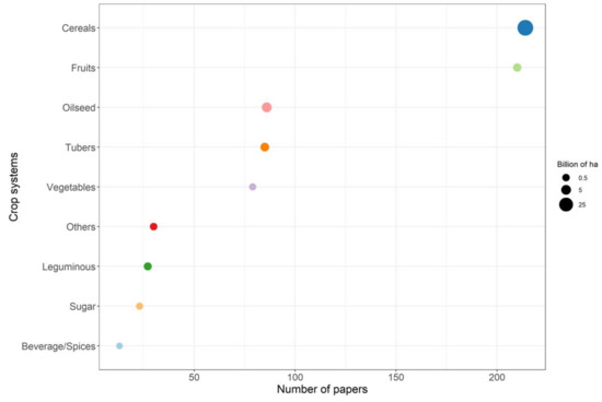Number of papers grouped by crop system. The dot size indicates the global cultivated area for each crop system.