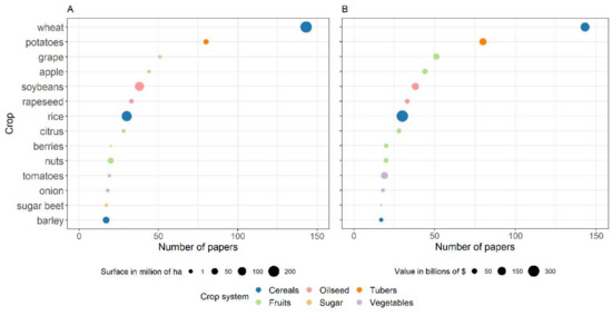 For nuts and berries, the number of papers published was similar (n = 20) and the produce value was not very different (36 vs. 28 billion $, respectively), however, the area cultivated was substantially greater for nuts than for berries (39 vs. 6 million ha, respectively). Few papers were also published concerning tomatoes (n = 19), onion (n = 18), sugar beet (n = 17), and barley (n = 17), which are grown on 5 million ha (except barley, which is grown on 51 million ha), and with values ranging from 92 billion $ for barley to 10.6 billion $ for sugar beet (except for tomatoes, with a value of 93 billion $).