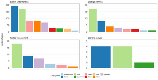In the case of fruit crops, 171 papers focused on models for system understanding, 18 for tactical management, and 17 for strategic planning. For cereals, 193 papers focused on system understanding, nine on tactical management, and eight on strategic planning. For vegetables, oilseeds and tubers, >80 papers considered models for system understanding, and only two to five for tactical management or strategic planning. For legumes, 25 papers focused on models for understanding the pathosystem, and only one for strategic planning; no papers were found for tactical disease management. For beverage/species, a low number of papers focused on models for system understanding, tactical management, and strategic planning. For sugar crops, all 23 papers focused on system understanding (Figure 6).