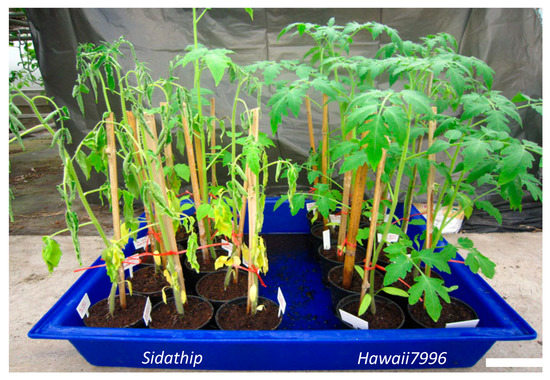 Susceptible tomatoes cv. Sidathip and resistant tomatoes cv. Hawaii7996 inoculated with R. solanacearum and symptoms development. Susceptible plants showed wilt symptoms after 7 dpi whereas the resistant Hawaii7996 showed no symptoms. Bar = 10 cm.