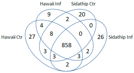 Venn diagram showing overlap pattern of the identified phosphoproteins in the stems of tomato cv. Hawaii7996 inoculated with R. solanacearum (Hawaii Inf), tomato cv. Hawaii7996 mock inoculation with sterilized water (Hawaii Ctr), tomato cv. Sidathip inoculated with R. soalanacearum (Sidathip Inf), and tomato cv. Sidathip inoculated with sterile water (Sidathip Ctr).