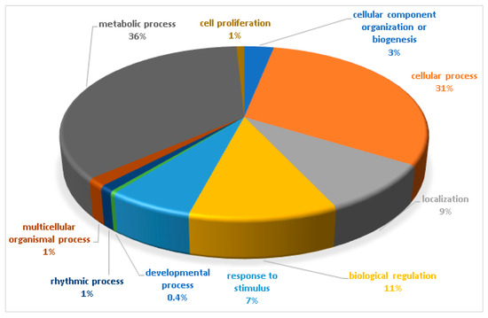 The biological functions of the total identified phosphoproteins were analyzed based on the gene ontology online database Panther16.0 (http://www.pantherdb.org/) (accessed on 12 May 2021). The biological processes are shown in Figure 3. The majority of identified phosphoproteins were involved in the metabolic process (36%), followed by the cellular process (31%). The most common biological processes included biological regulation (11%), localization (9%), and response to stimulus (7%).