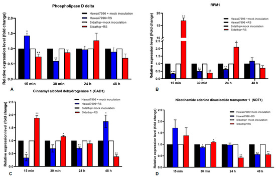 Four out of six genes commonly identified in the resistant cultivar Hawaii7996 inoculated by R. solanacearum, which are cinnamyl alcohol dehydrogenase 1 (CAD1), nicotinamide adenine dinucleotide transporter 1 (NDT1), phospholipase D delta (PLDDELTA), and disease resistance protein RPM1 (RPM1), were selected for further function investigation. The expressions of these genes were analyzed by qRT-PCR as shown in Figure 4.