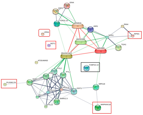 Protein interaction network generated by STITCH 5.0 displaying the association between six phosphoproteins identified from resistant plants inoculated with R. solanacearum and plant hormones. RPM1 showed strong association with SA through NPR1 in the protein network. Phospholipase D delta (PLDDELTA) and MAP3K showed associations with abscisic acid. Nicotinamide adenine dinucleotide transporter 1 (NDT1), cinnamyl alcohol dehydrogenase 1 (CAD1 or F28P22.13), and VRN1 showed no network interaction.