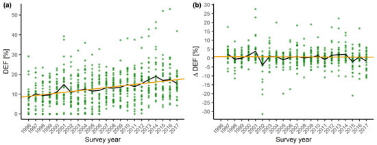 Overall trend of crown vitality parameters from 1996–2017. (a) Defoliation trend of European beech (Tau = 0.78, Sen’s slope = 0.39, p < 0.001, orange line) and annual overall mean defoliation (DEFi, black line). (b) Defoliation change trend of European beech (Tau = −0.05, Sen’s slope = −0.01, p = 0.73, orange line) and annual overall change in mean defoliation (ΔDEFi, black line). Points represent annual plot mean values.